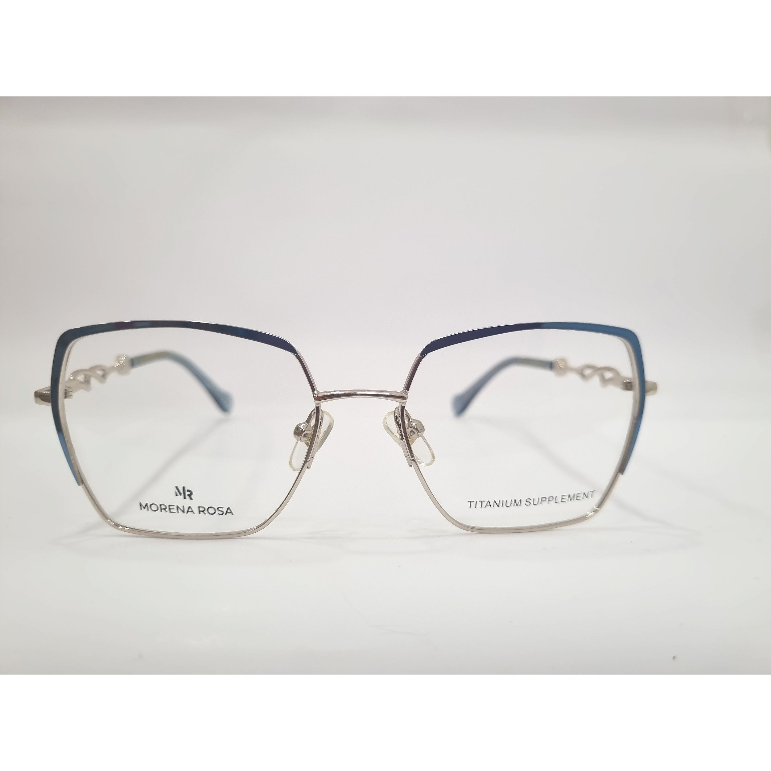 Armação em metal prata, com detalhe em azul no aro, e hastes com detalhes.